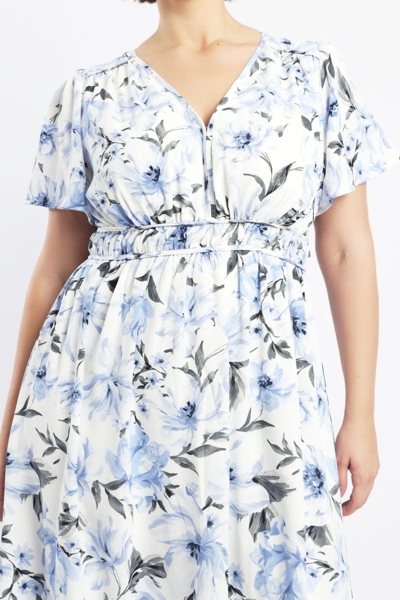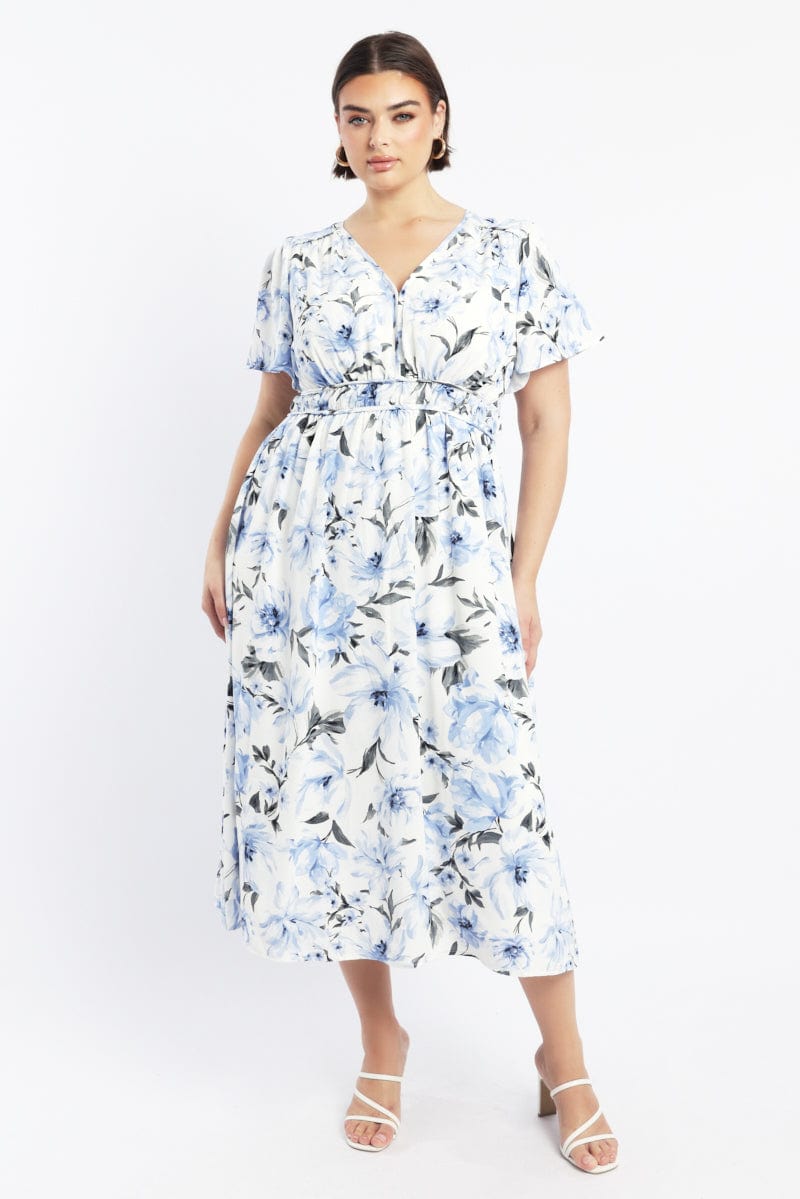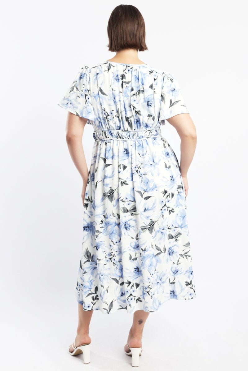 Blue Floral Midi Dress Short Sleeve V-Neck Floral