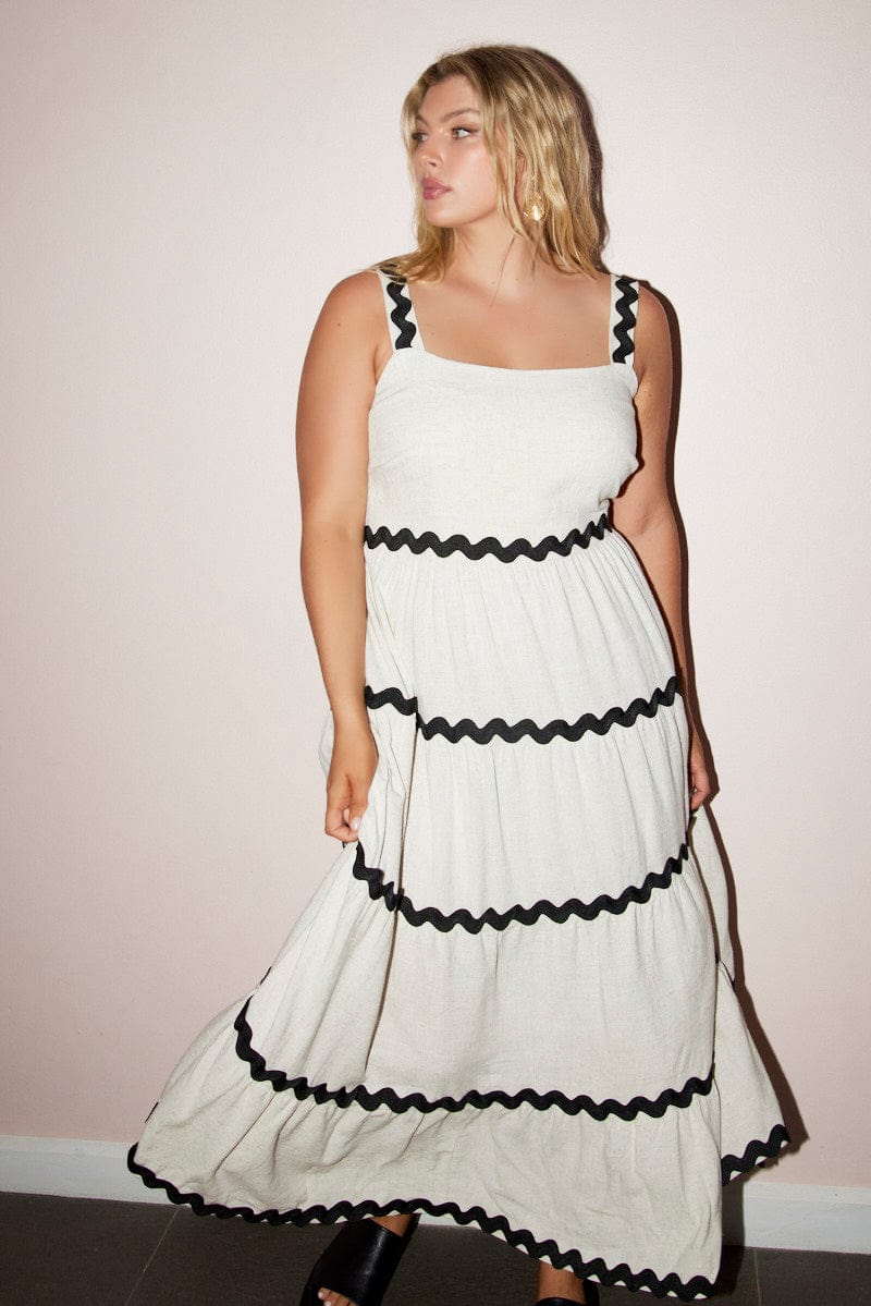 Beige Midi Dress Sleeveless Ric Rac Tiered Linen Blend