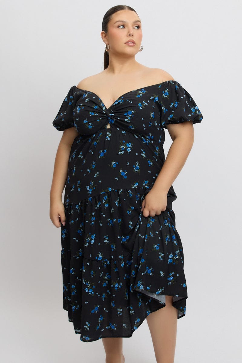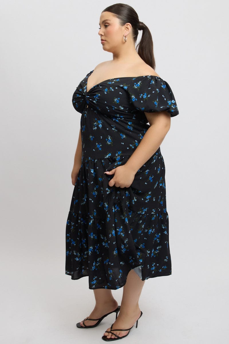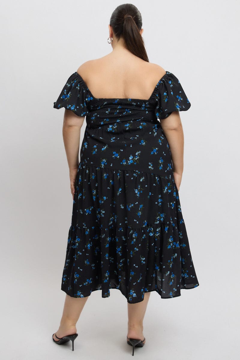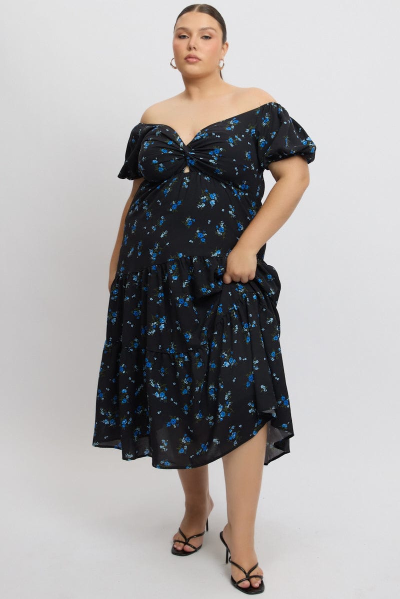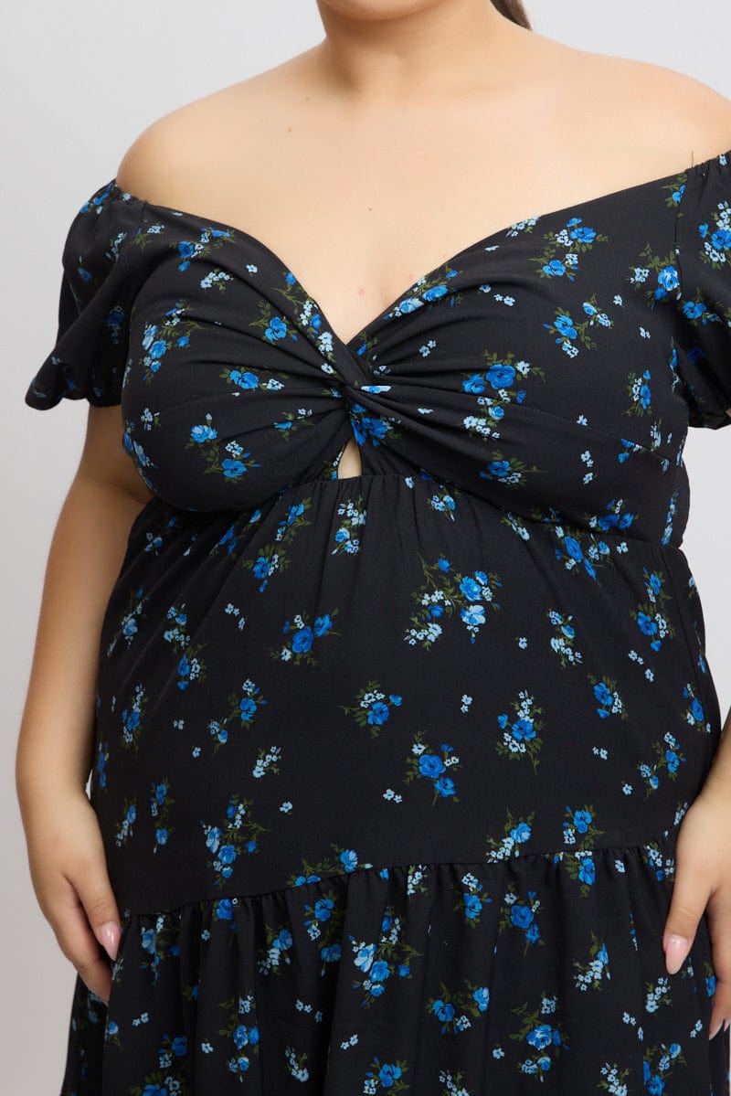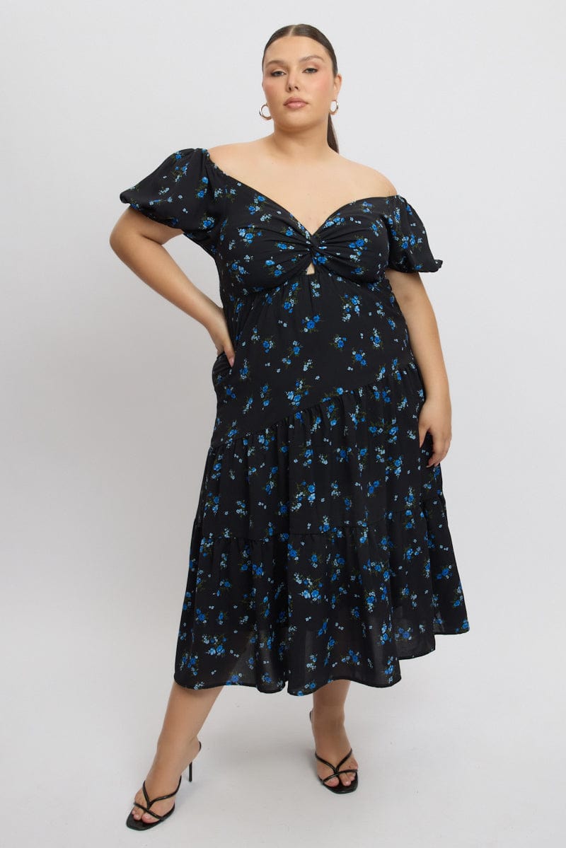 Black Ditsy Midi Dress Short Sleeve Cut Out