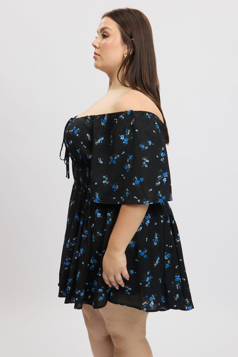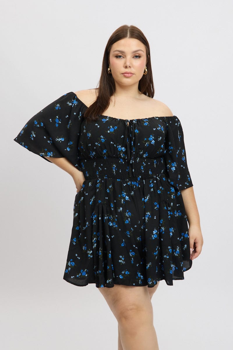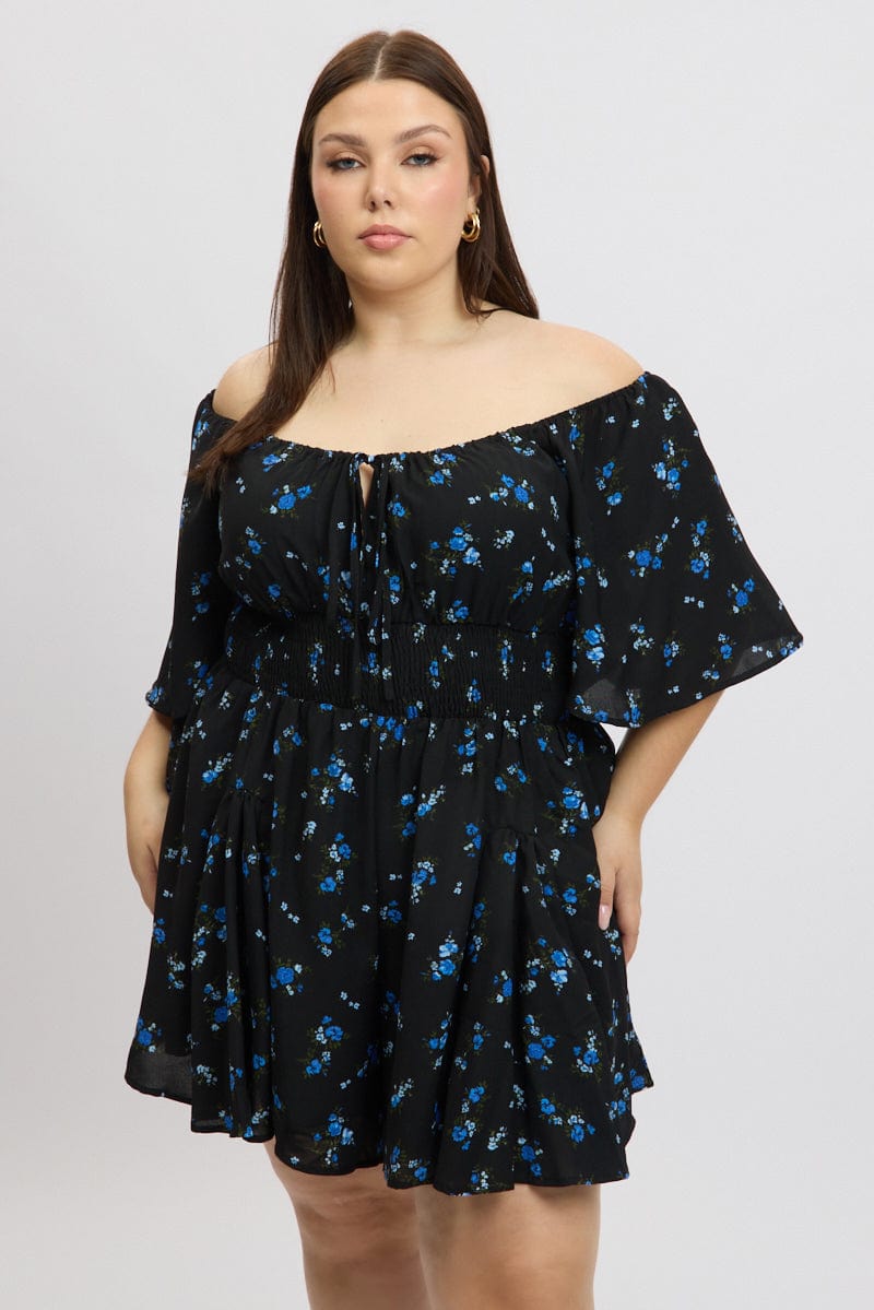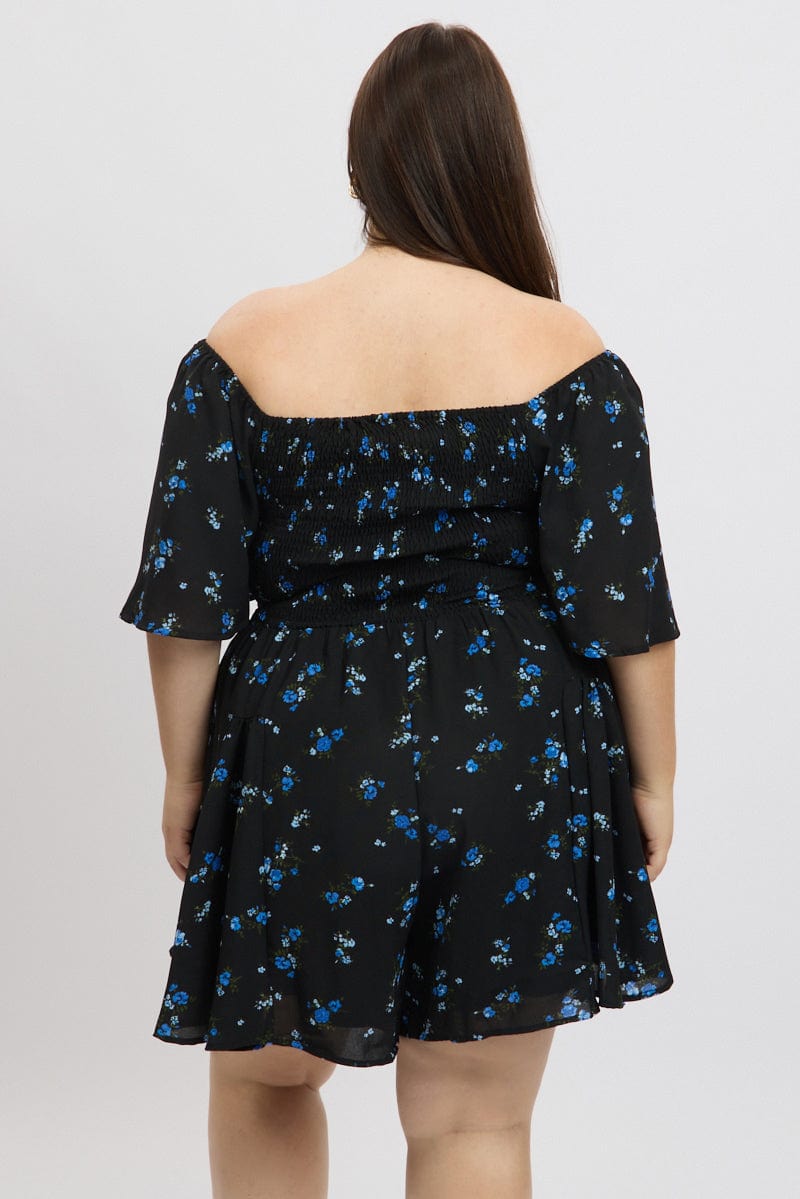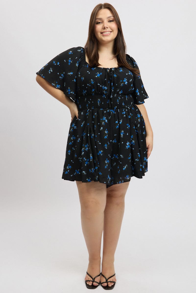 Black Ditsy Playsuit Short Sleeve Ruched Bust