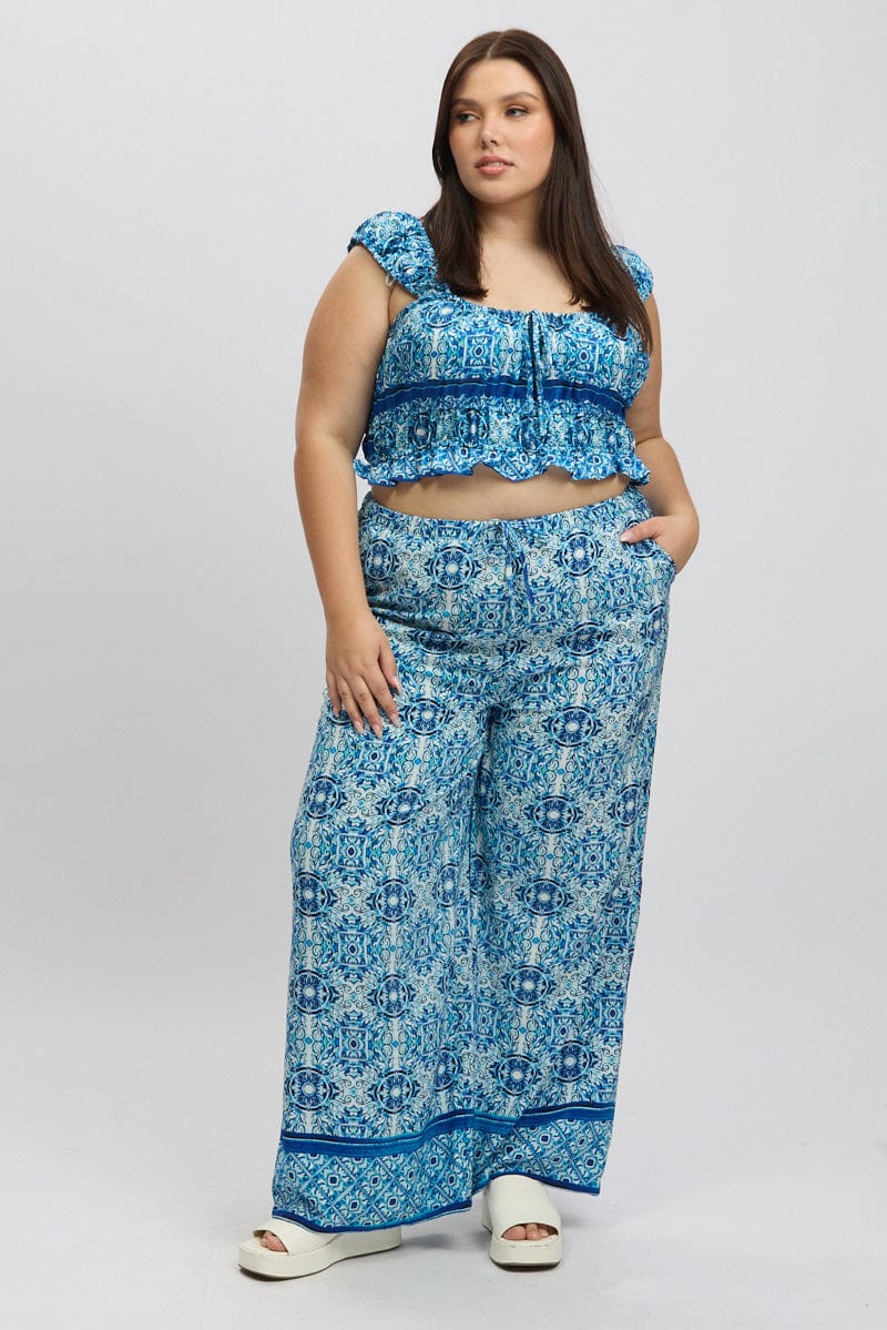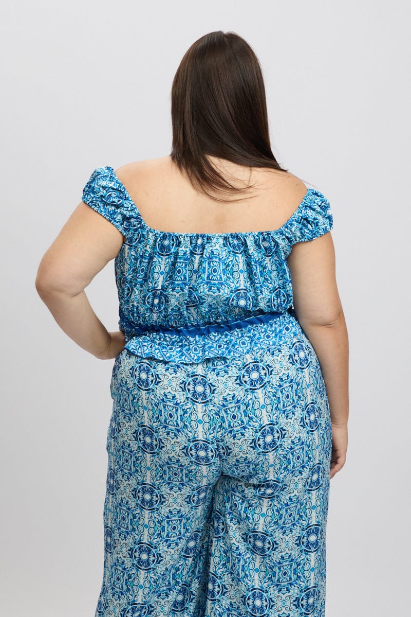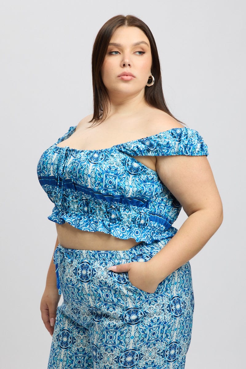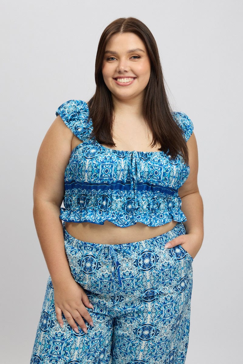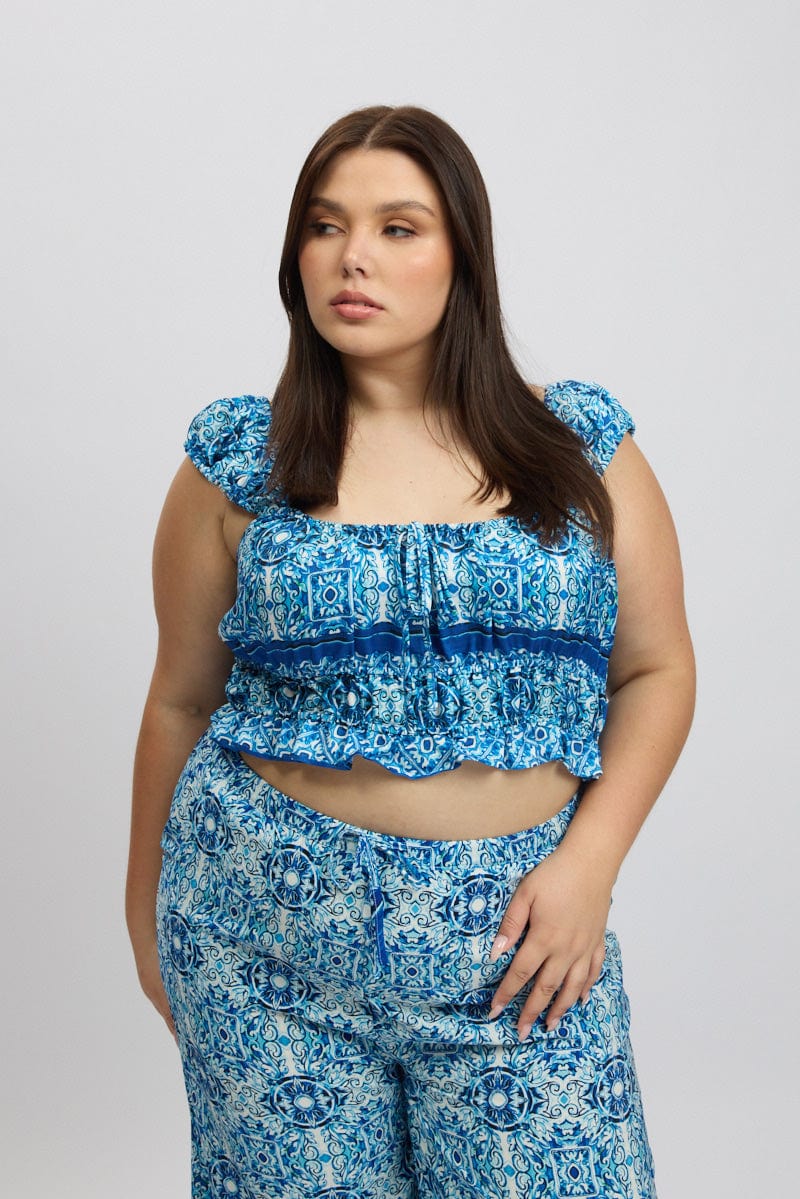 Blue Boho Crop Top Short Sleeve Ruched Bust