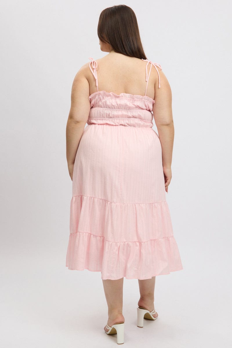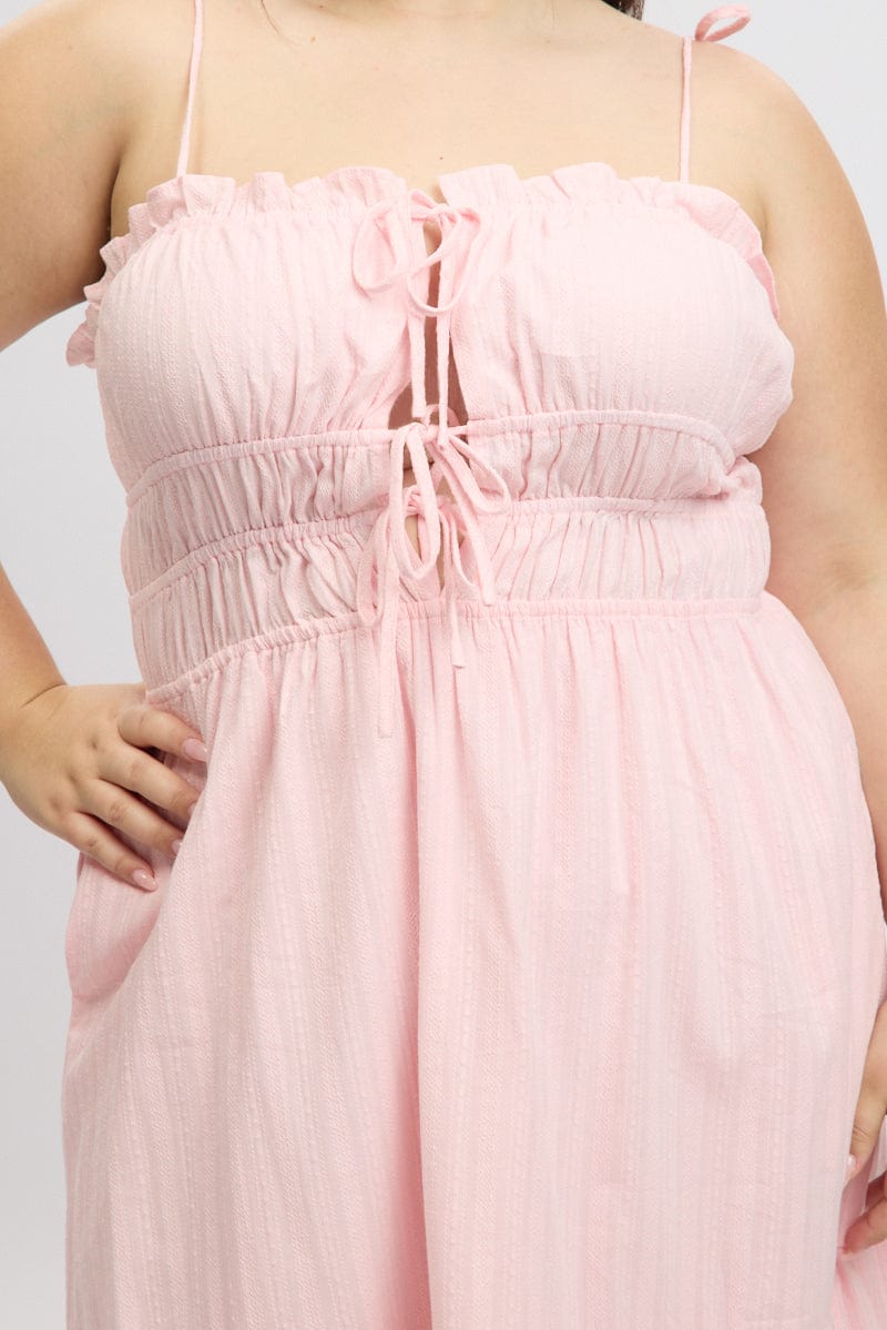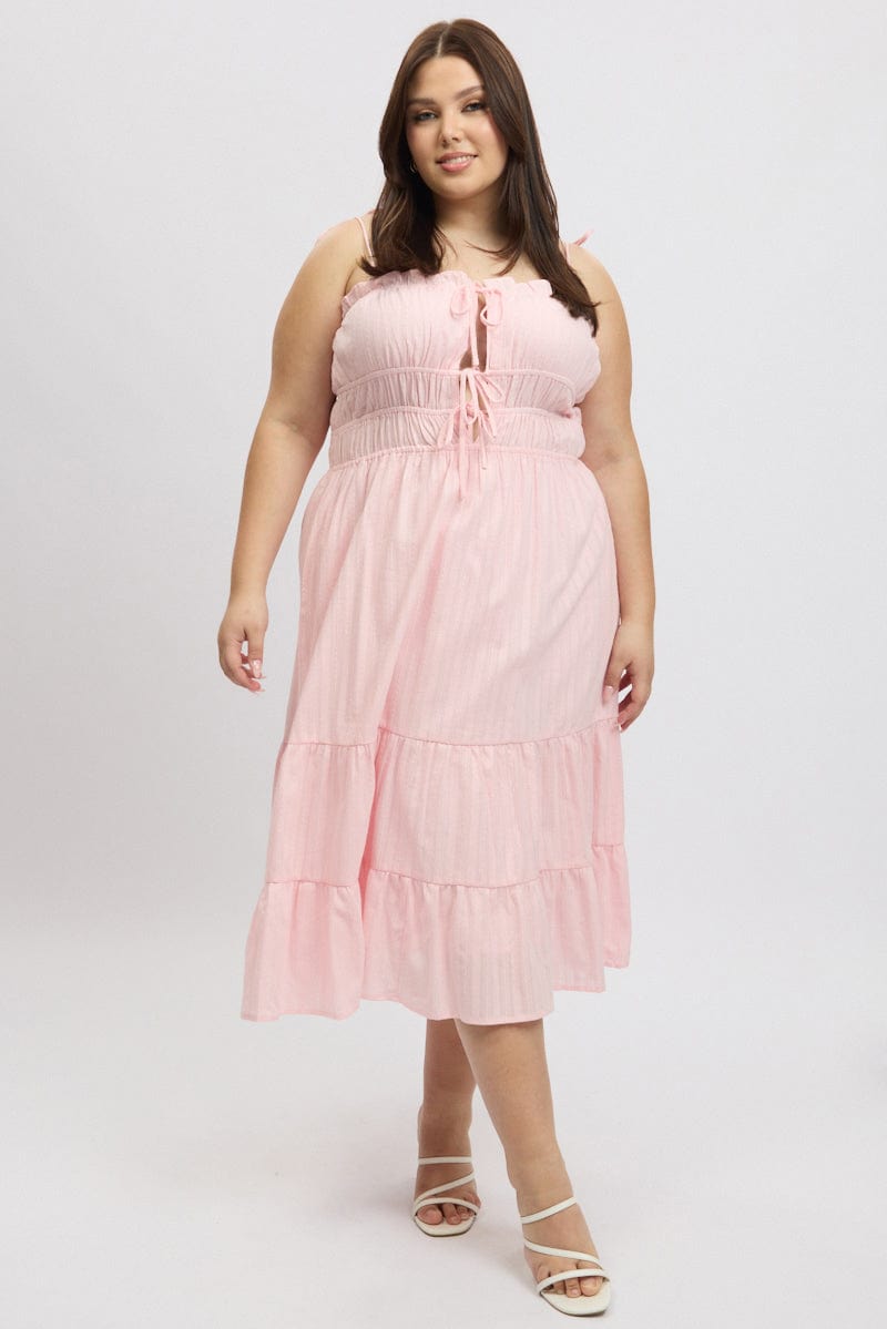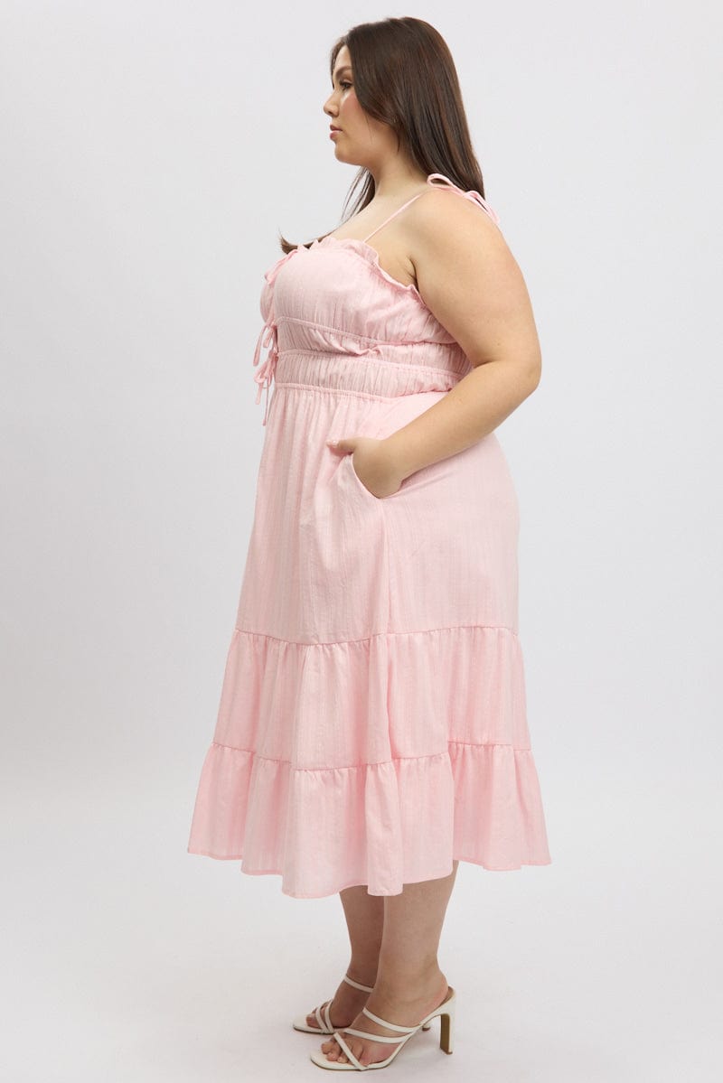 Pink Midi Dress Sleeveless Tie Front Tiered Textured