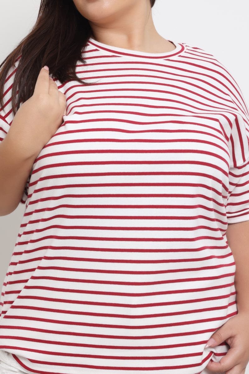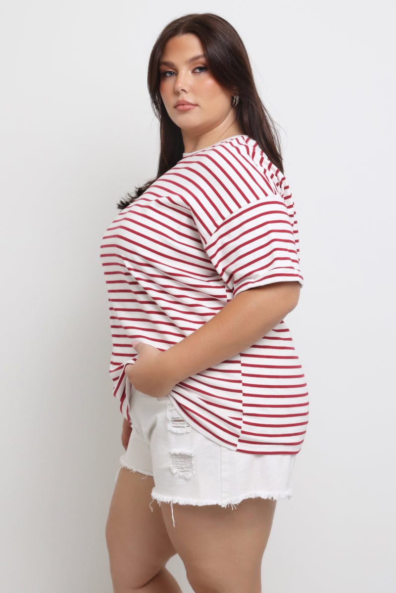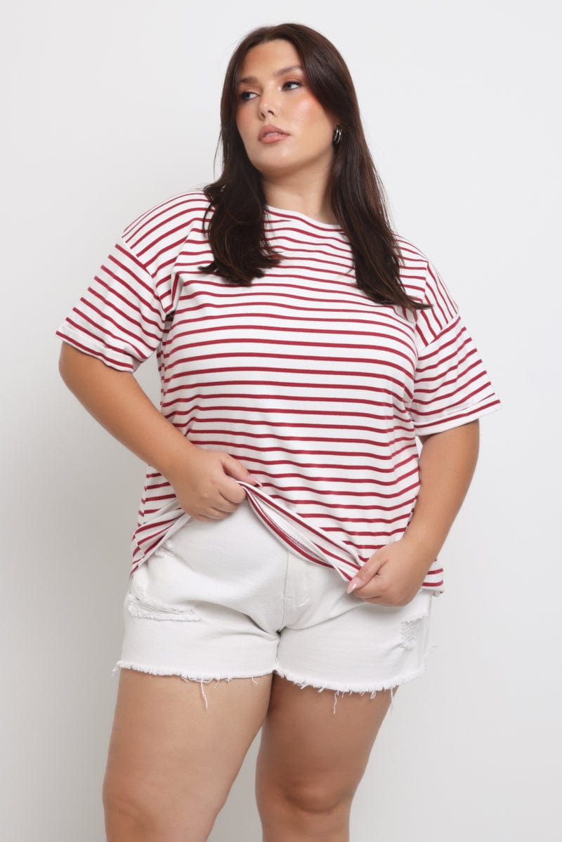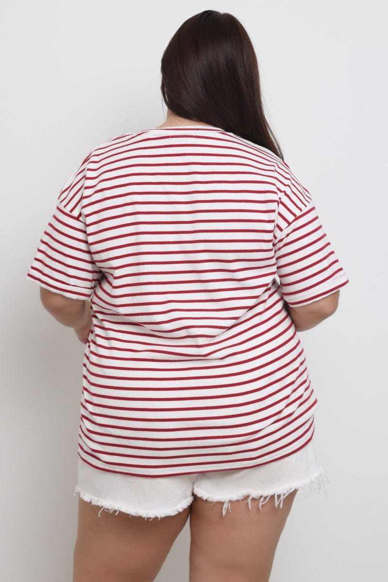 Red Stripe Oversized T shirt Short Sleeve Crew Neck