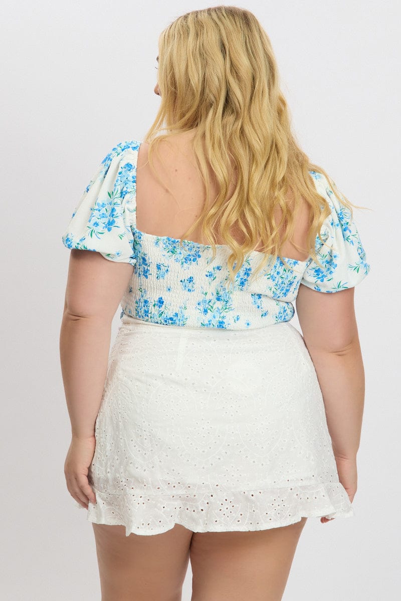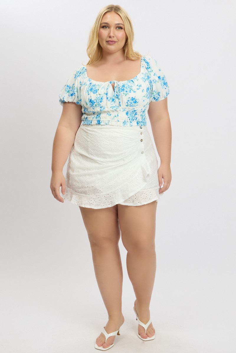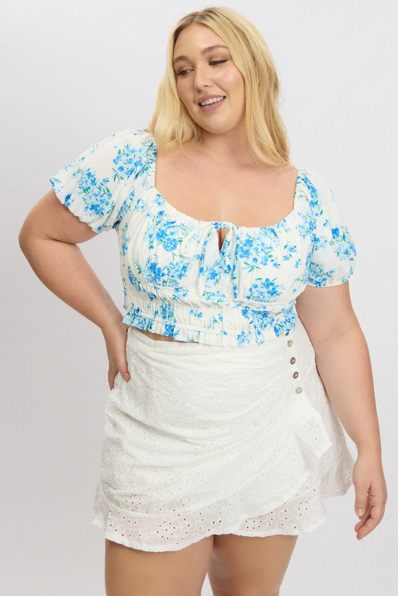 White Floral Crop Top Short Sleeve Ruched