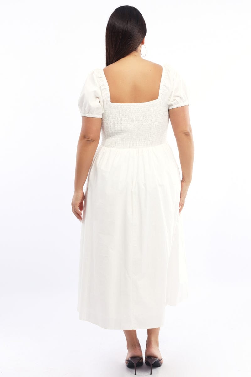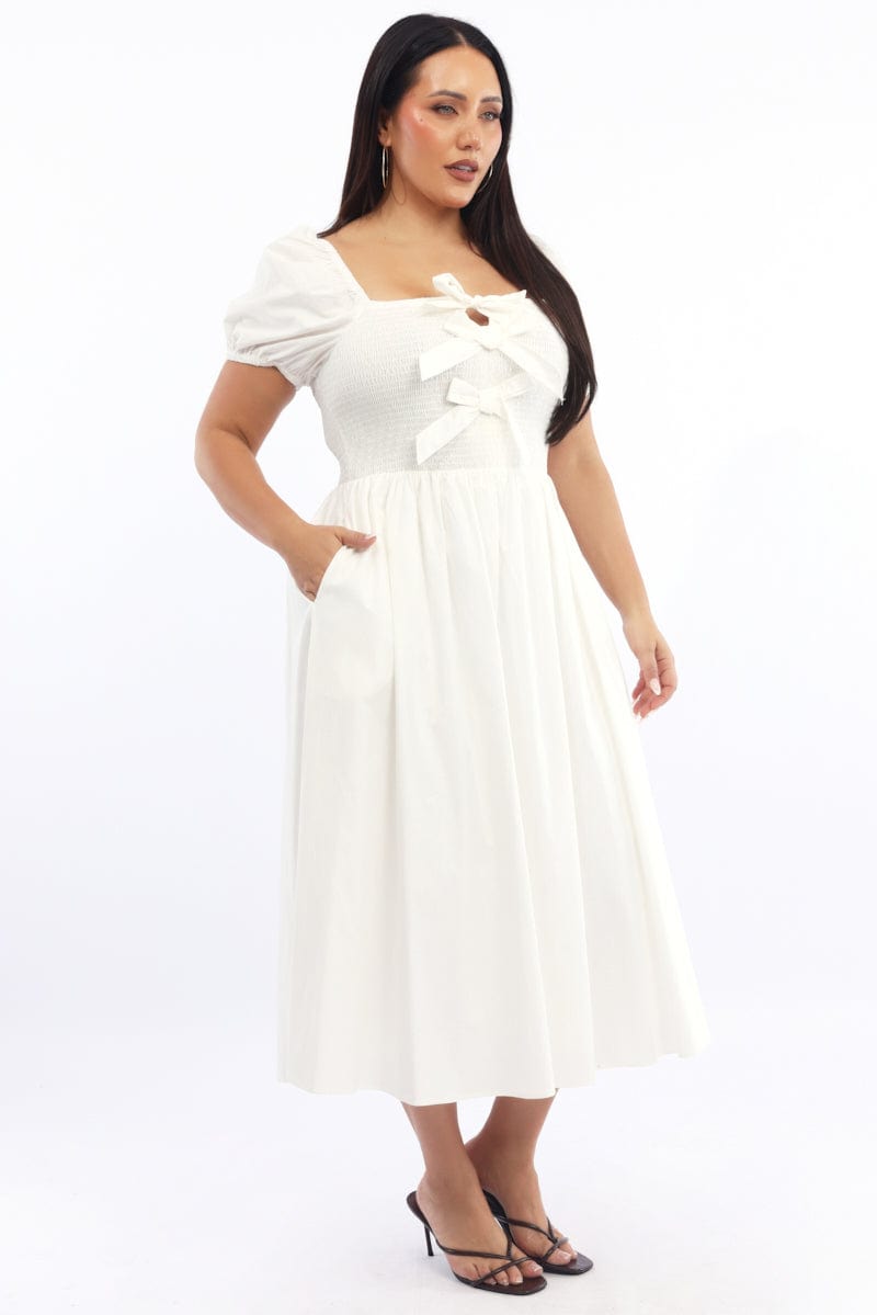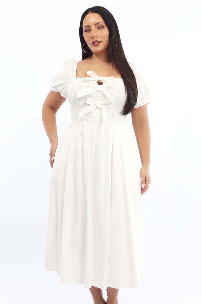 White Midi Dress Short Sleeve Shirred Body Ribbon Front