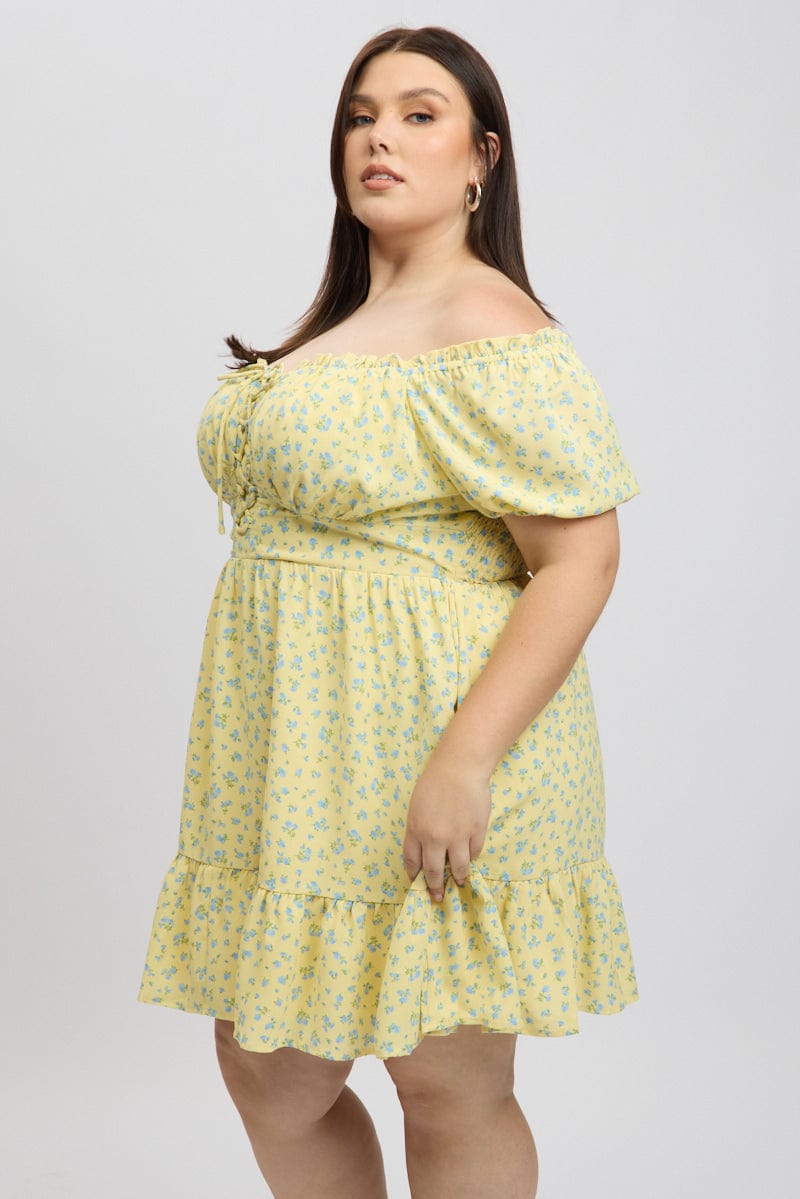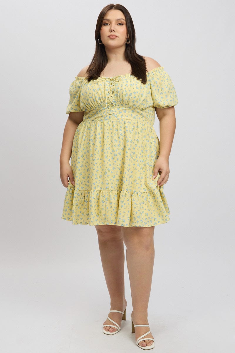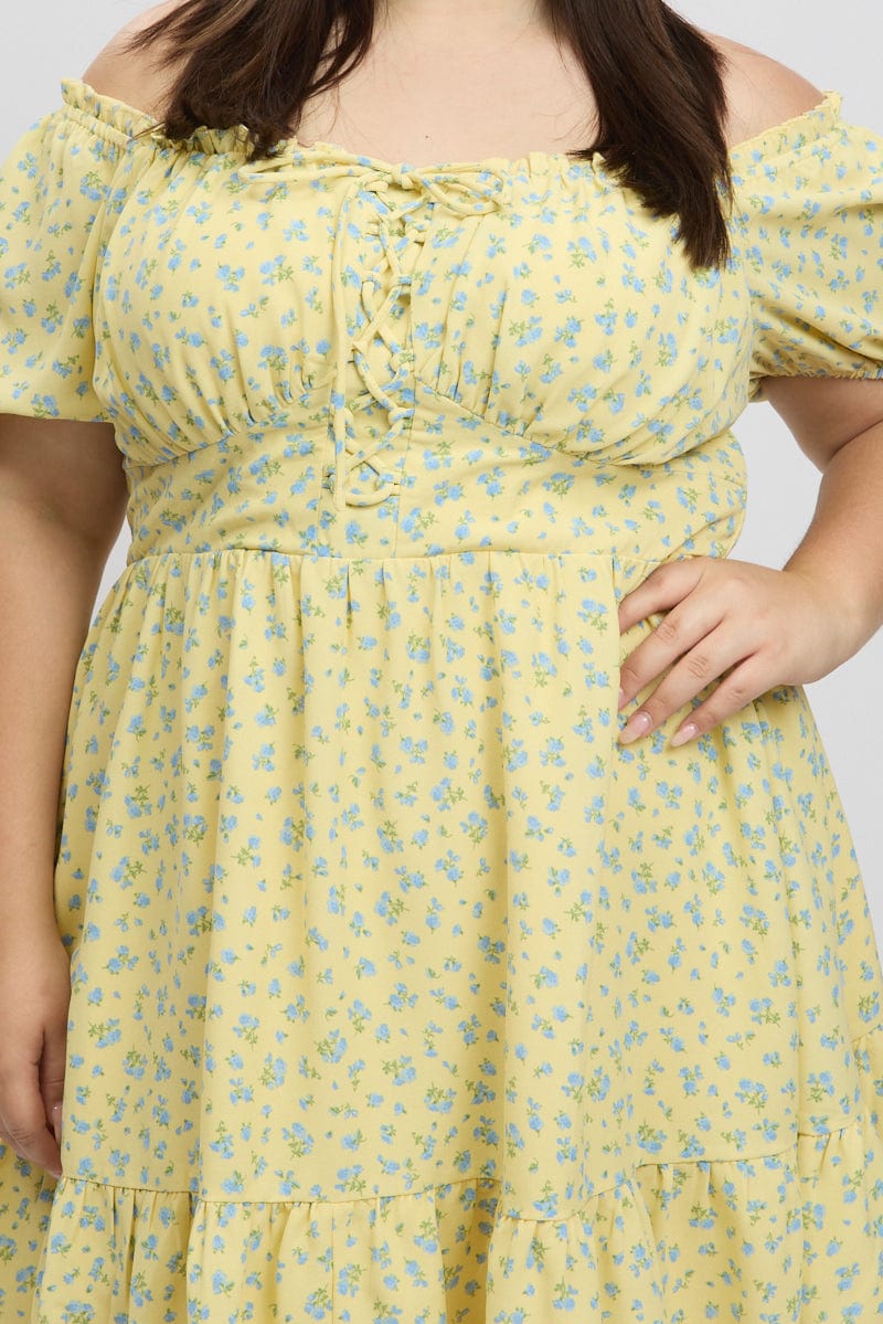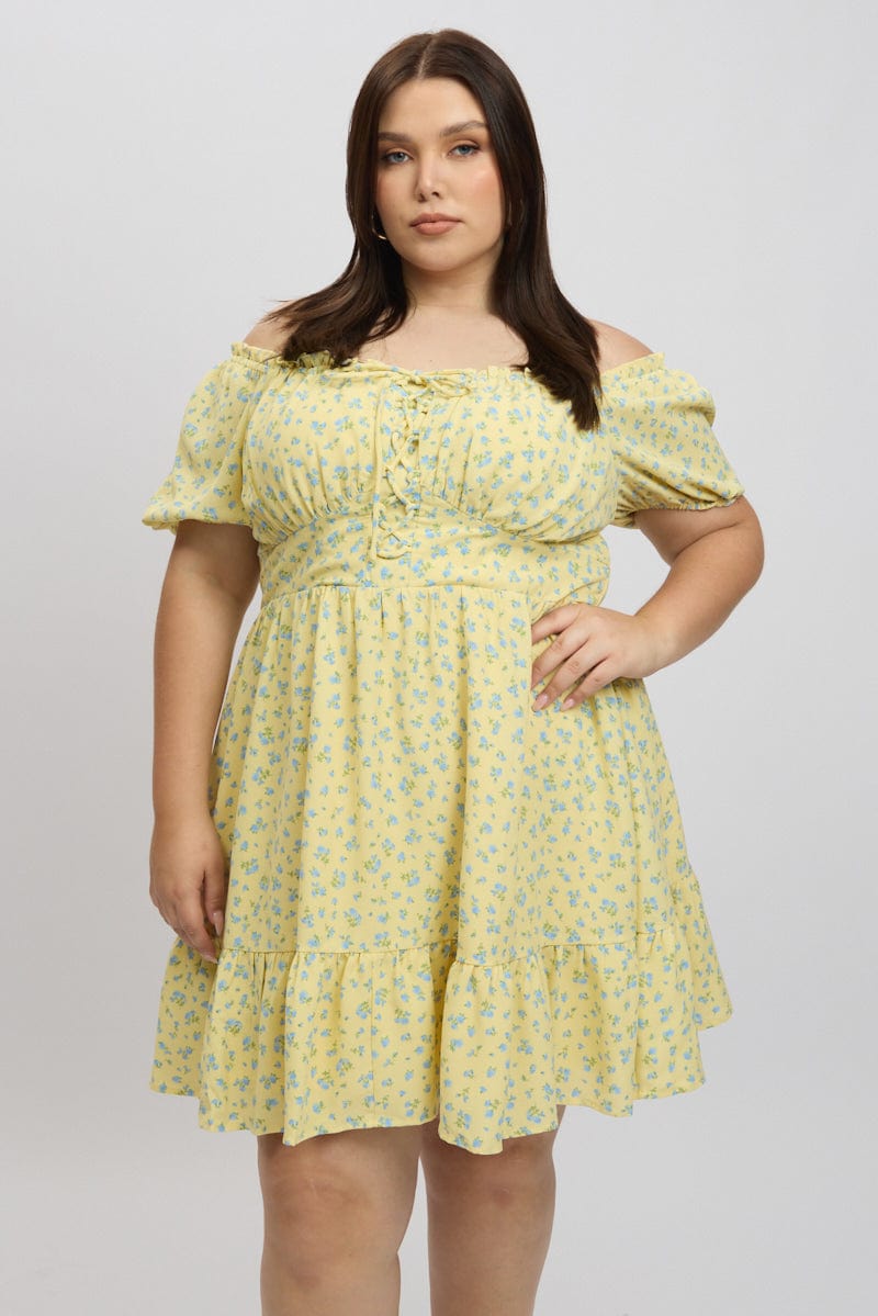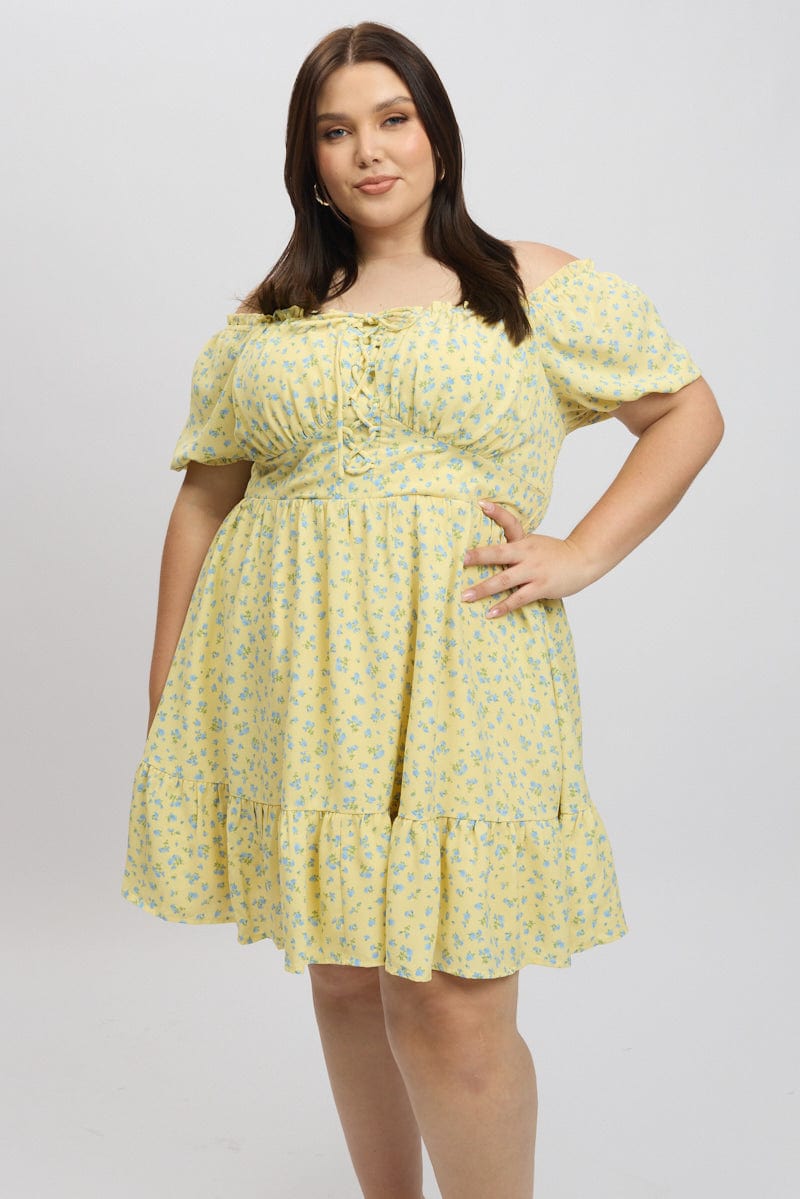 Yellow Ditsy Lace Up Puff Sleeve Minidress